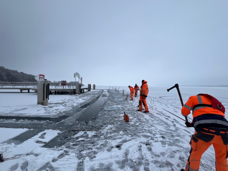 Die Stadtverwaltung Waren (Müritz) informiert darüber, dass der Stadtbauhof am 27. Januar mit dem Freischneiden der städtischen Brücken und Stege begonnen hat. Die Arbeiten wurden zunächst an der Brücke an der „Waldschänke“ aufgenommen. In der weiteren Abfolge werden die Brücke „Ecktannen“ anschließend die Brücke am „Volksbad“ sowie die „Kietzbrücke“ freigeschnitten. Die Maßnahme ist aus bautechnischen und sicherheitsrelevanten Gründen notwendig. Bei längeren Frostperioden bildet sich unter Brücken und Stegen oft Eis, das sich durch Strömungen, Temperaturveränderungen und Wind ungleichmäßig verteilt. Diese Eisansammlungen und die Größe der zusammenhängenden Eisfläche können dann Druck auf die tragenden Teile der Bauwerke ausüben und somit ihre Funktionsfähigkeit gefährden. Mit dem gezielten Freischneiden des Eises wird der Druck auf die Brücken und Stege verringert und die Sicherheit für bleibt gewährleistet.
