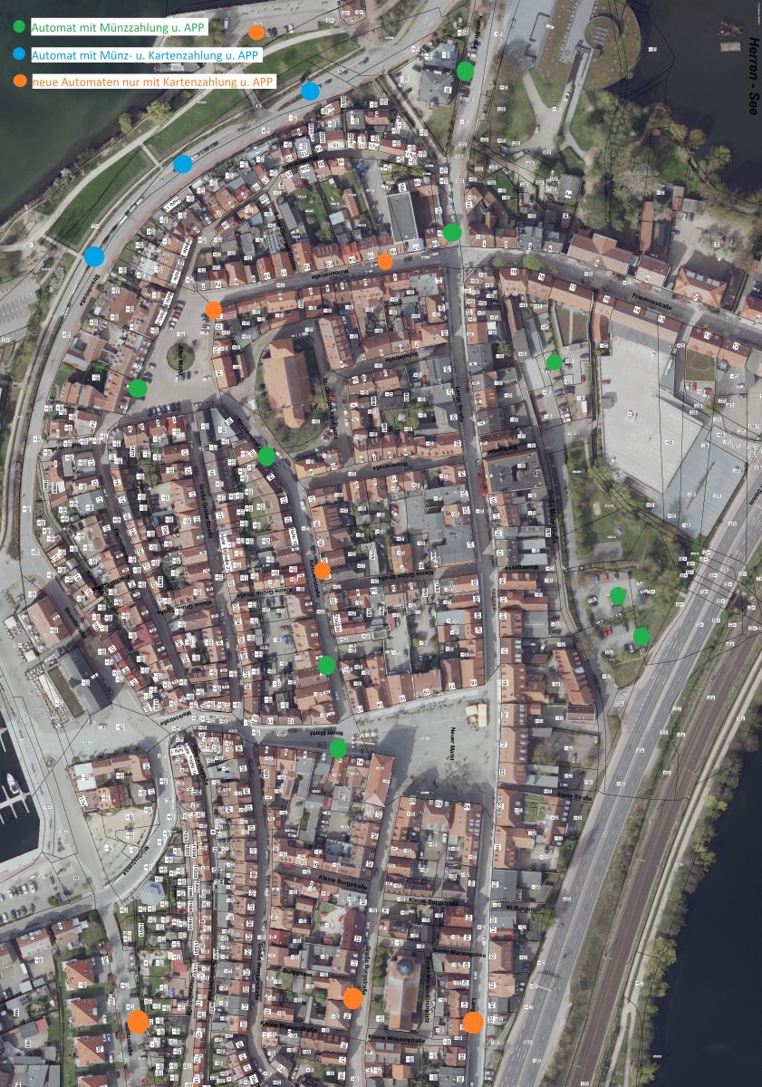 Die Münzentleerung der Parkautomaten ist für die Stadt mit einem hohen Aufwand und hohen Kosten verbunden. Es ist daher geplant, die Gebührenzahlung auf lange Sicht zu digitalisieren. In einem ersten Schritt werden 7 innerstädtische Parkautomaten, die aufgrund ihres Alters auszutauschen sind, auf rein bargeldlose Zahlung umgerüstet. An diesen Automaten wird dann künftig nur noch die Kartenzahlung und die Zahlung per App möglich sein. Aufgrund der Lieferzeiten der Parkautomaten rechnet die Stadtverwaltung mit dem Aufstellen der neuen Automaten zu Anfang Januar 2026. Die Übersicht zeigt die betroffenen Parkautomaten im Innenstadtbereich der Stadt Waren (Müritz).