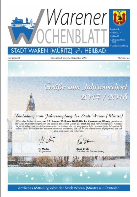 Die Stadt Waren (Müritz) lädt herzlich zum diesjährigen Jahresempfang am Freitag, den 9. Januar 2026, um 18:00 Uhr ein. Die Veranstaltung findet im Kurzentrum Waren (Müritz) auf dem Nesselberg statt. ... Ein Shuttle-Service vom Parkplatz zum Kurzentrum ist von der Freiwilligen Feuerwehr Waren (Müritz) eingerichtet.