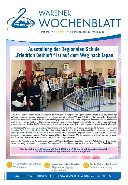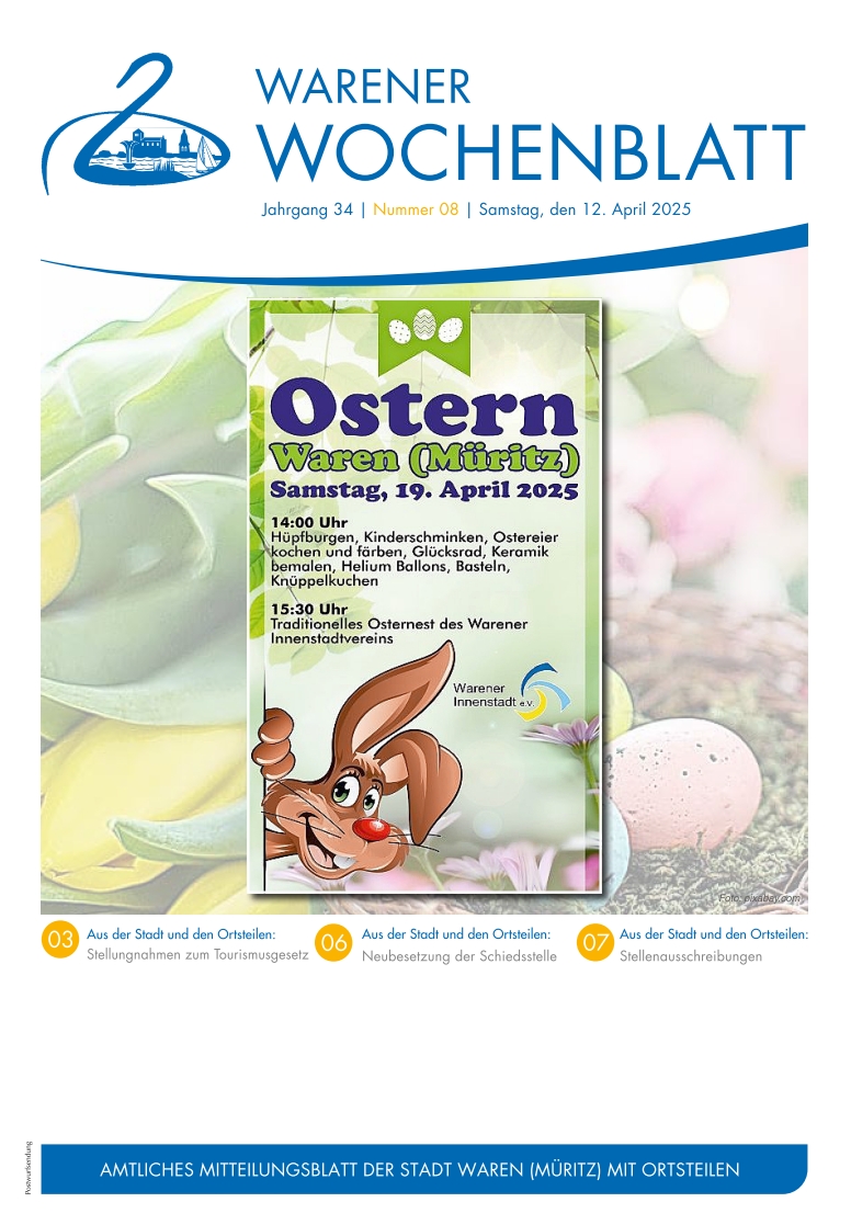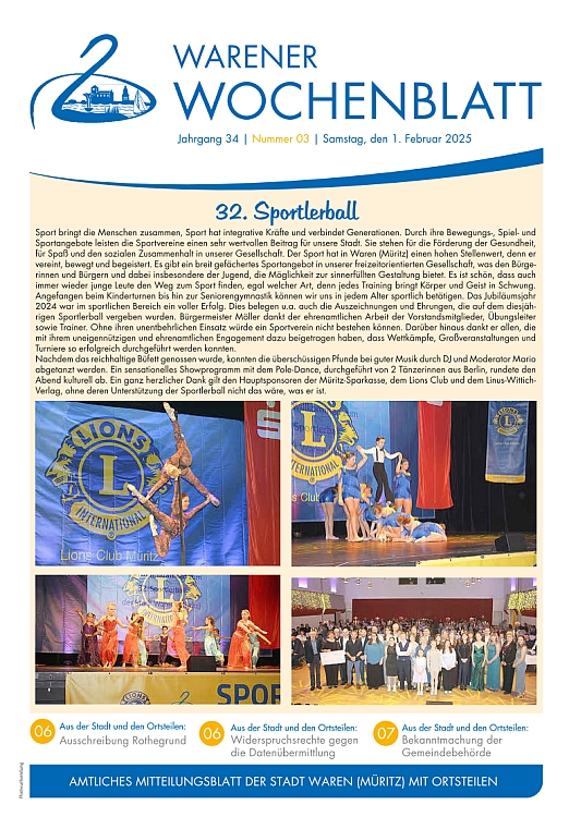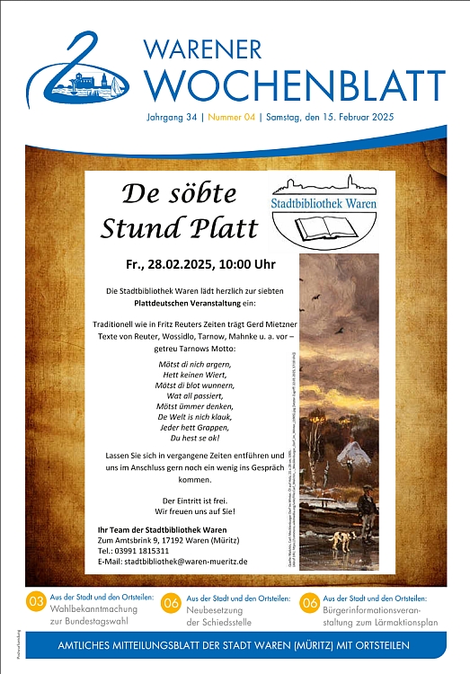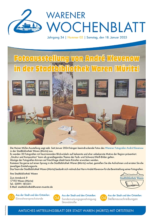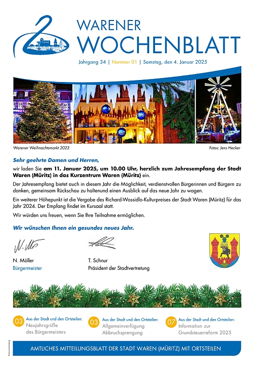 Die Nr. 1 des Warener Wochenblattes beinhaltet Steuer- und Abgabenbescheide, einen Rückblick auf weihnachtliche Aktionen sowie die Einladung zum Jahresempfang an die Bürgerinnen und Bürger.