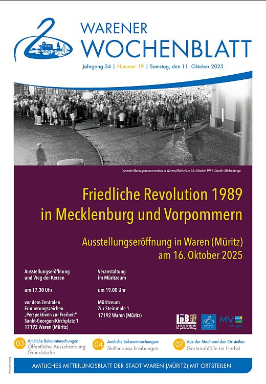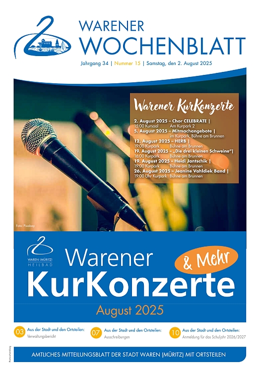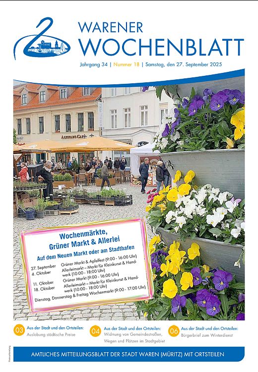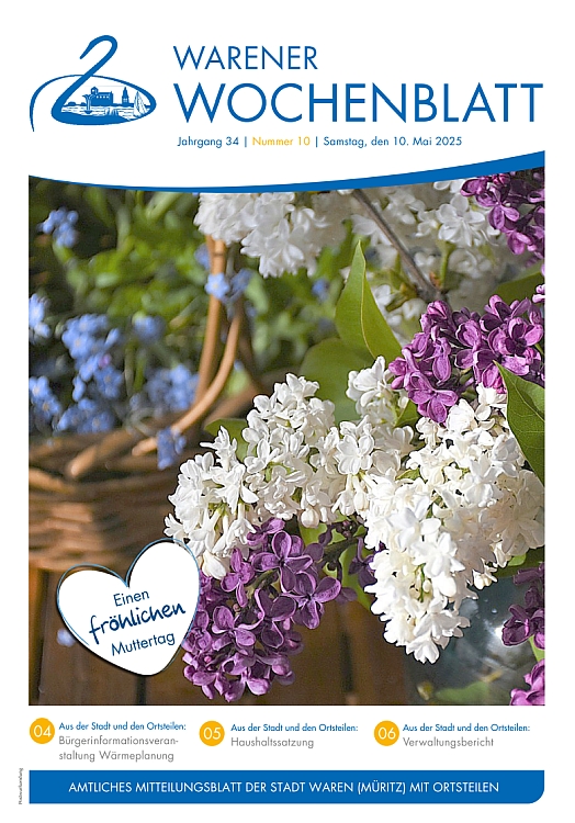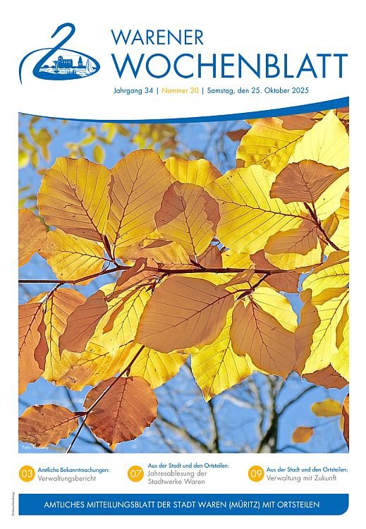 Aktuelle Informationen aus der Verwaltung erscheinen im Warener Wochenblatt, dem Mitteilungsblatt mit öffentlichen Bekanntmachungen der Stadt Waren (Müritz). Es erscheint 14-tägig. Im Internet finden Sie Beiträge und Bilder der jeweiligen Ausgabe auf den Seiten: www.wittich.de (Internetpräsentation der Verlag und Druck Linus Wittich KG).