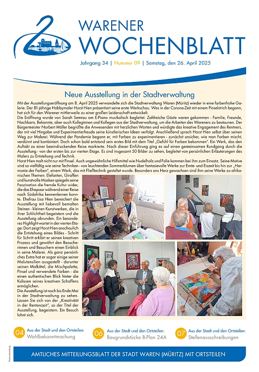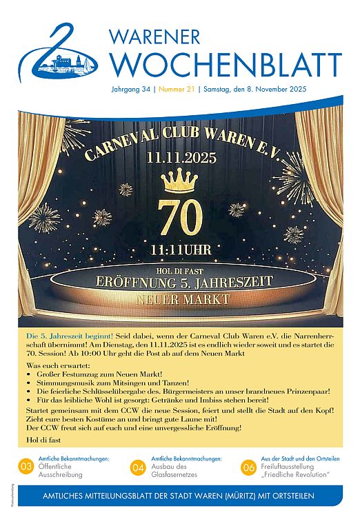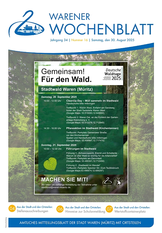 Die Nr. 23 des Warener Wochenblattes enthält öffentliche Ausschreibungen, Informationen des Senioren- und Behindertenbeirates sowie Veranstaltungshinweise.