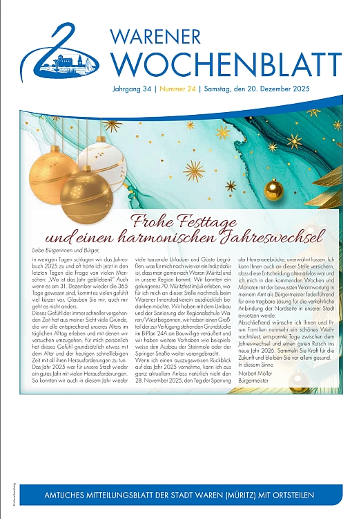 Die Nr. 24 des Warener Wochenblattes enthält die Weihnachtswünsche und die Grüße des Bürgermeisters zum Jahreswechsel , die Einladung zum Jahresempfang sowie Hinweise auf die Schließzeiten der Stadtverwaltung zwischen den Festen.
