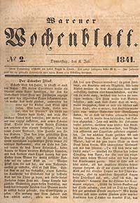 Am 01. Juli 1841 erschien die erste Ausgabe des WWB - Warener Wochenblattes, das ab 1866 Warener Zeitung genannt wurde. Die erste Originalausgabe existiert noch und ist in der Universitätsbibliothek Rostock archiviert. Im stadtgeschichtlichen Museum Waren findet man jedoch die Ausgaben, beginnend mit der Ausgabe 2 vom 8. Juli 1841. In einem noch etwas anderem Outfit, aber durchaus unterhaltend, erschien von nun an jedem Donnerstag ein Mitteilungsblatt. Später kam es sonnabends heraus - wie auch heute wieder.