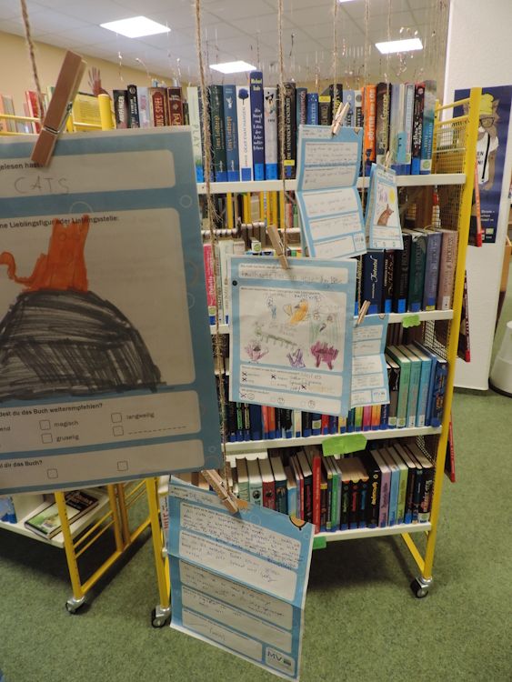 Das Team der Stadtbibliothek Waren (Müritz) hat sich sehr über die Berichte der Kinder zu den gelesenen Büchern gefreut, ebenso über die ausgefüllten Fragebögen und gemalten Bilder. Diese sind zur Zeit in den Gängen der Kinderabteilung "schwebend" ausgestellt.