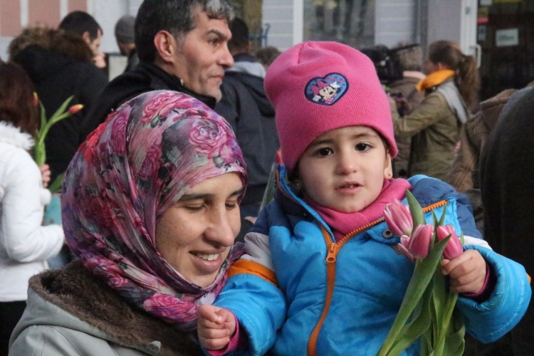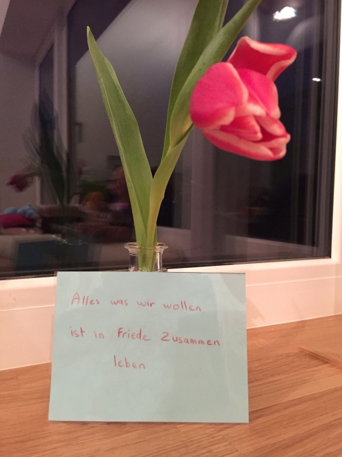 Am Freitag, den 12. Februar, haben einige der in Waren (Müritz) lebenden „Refugees“ mit einer Aktion auf dem Marktplatz ihren Absichten hier in Deutschland einen bunten Nachdruck verliehen. Mit einer Einladung zum syrischen Tanz, dem Verteilen von Blumen und Dankeskärtchen und einer berührenden Ansprache sollte nicht nur ein Zeichen für Toleranz und Menschlichkeit gesetzt und sich bei der Bevölkerung der Stadt für das herzliche Willkommen, die Hilfestellungen und das Mitgefühl bedankt werden, sondern vor allem deutlich gemacht werden, wonach die „Refugees“ am meisten streben, nämlich nach einem friedlichen und respektvollen Zusammenleben. Durch die orientalischen Klänge wurde sogar die Sonne als Tanzbegleitung auf den Marktplatz gelockt. Nach und nach trauten sich auch die Einheimischen in die schwungvolle Runde der Tanzenden und so reihte sich ebenfalls der Bürgermeister mit ein. Die Aktion ging von den „Refugees“ selbst aus und wurde von den ehrenamtlich und hauptamtlich Betreuenden lediglich organisatorisch unterstützt. Der Wunsch war es, Vorurteile und mögliche Ängste in der Bevölkerung abzubauen. Die „Refugees“ möchten sich und ihre friedliche Gesinnung präsentieren, sich von Gewalt und Feindseligkeit jeglicher Art distanzieren und einfach in Kontakt mit den Einheimischen kommen. Wie man bereits auf den Fotos gut erkennen kann, ist das einander Kennenlernen für alle eine wahre Bereicherung. Die Ansprache wurde von Ahmad verfasst und vorgetragen. Die deurtsche Übersetzung wurde anschließend von Muwaffaq vorgetragen.