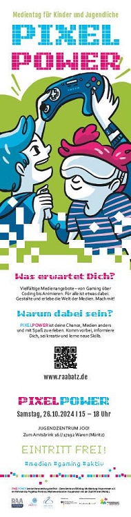 Der Medientag PIXEL.POWER ist eine Veranstaltung der RAAbatz Medienwerkstatt (RAA M-V) in Kooperation mit der Stadt Waren (Müritz). Mit dabei sind u.a. das Medienzentrum Greifswald, die Computerspielschule Greifswald, der Papenberger Jugendtreff, das Jugendzentrum JOO!, die Medienwerkstatt Identity Films, das Medienpädagogische Zentrum des IQ M-V, die Filmrauch Productions, das Jugendradio youngsounds und weitere Medienschaffende.