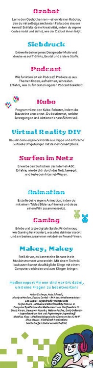 Dort können Besucher die digitale Spielewelt erkunden und mehr über Gaming erfahren. Programmierinteressierte können kleine Roboter, sogenannte Ozobots und Kubos, mithilfe von Farbcodes steuern und erleben einen spannenden Einstieg in die Grundlagen von Robotik und Programmierung. Wer gerne kreativ werden und eigene Geschichten zum Leben erwecken möchte, kann kleine Trickfilme produzieren. Virtuelle Realitäten lassen sich ebenfalls entdecken durch eine VR-Brille, die selbst gebaut werden kann. Im Audiobereich bietet sich die Gelegenheit, zu erfahren, wie ein Podcast entsteht – von der Ideenfindung über die Aufnahme bis hin zur Bearbeitung. Technikfans können mit Makey Makey experimentieren. Mit diesem Technikbaukasten lassen sich alltägliche Gegenstände an einen Computer anschließen und so kreative Geräusche erzeugen. Individuelle Designs können beim Siebdruck gestaltet und auf T-Shirts, Beuteln oder anderen Stoffen gedruckt werden. Darüber hinaus bietet der Medientag auch die Möglichkeit, das eigene Wissen über digitale Sicherheit zu testen. Bei der „Führerscheinprüfung fürs Web“ können die Besucher spielerisch herausfinden, wie sicher sie im Internet unterwegs sind und gleichzeitig wichtige Tipps zum sicheren Surfen erhalten.