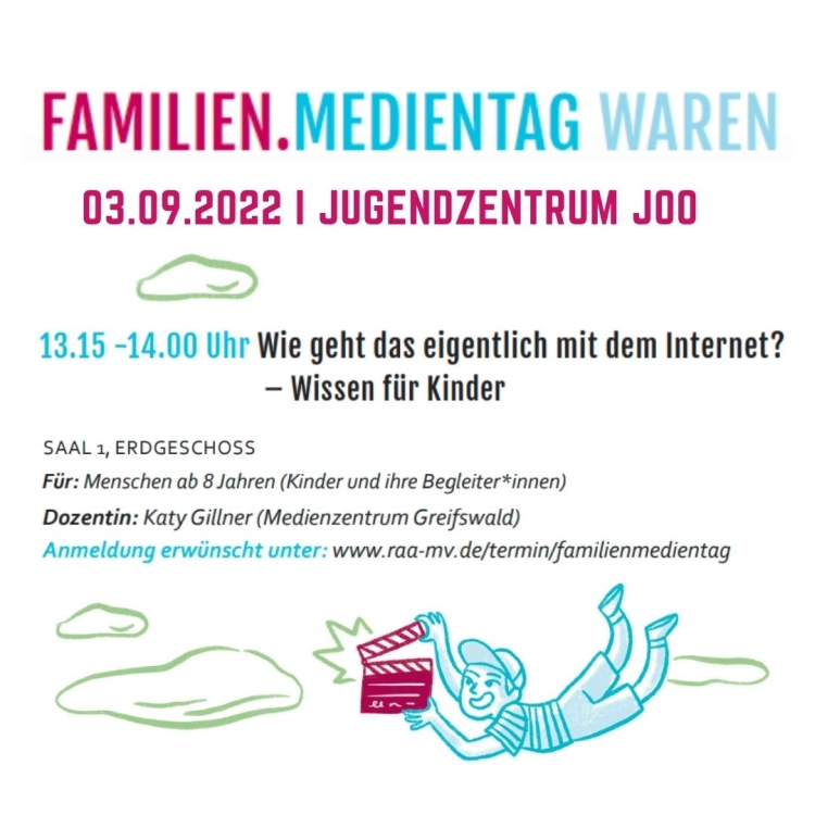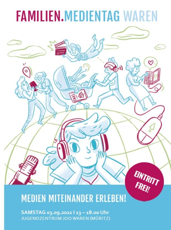 Der FAMILIEN.MEDIENTAG WAREN , der am 03.09.2022 von 13.00 bis 18.30 stattfindet, bietet Gelegenheit, mehr über Medien zu erfahren. Kinder, Jugendliche, Familien und Interessierte können sich über aktuelle Entwicklungen in der medialen Welt informieren, Neues erfahren und Medienformate ausprobieren. Es werden Vorträge, Workshops und Mitmachangebote stattfinden – für jede und jeden ist etwas dabei. Die Veranstaltung bietet die Chance, über Generationen hinweg Medien zu entdecken