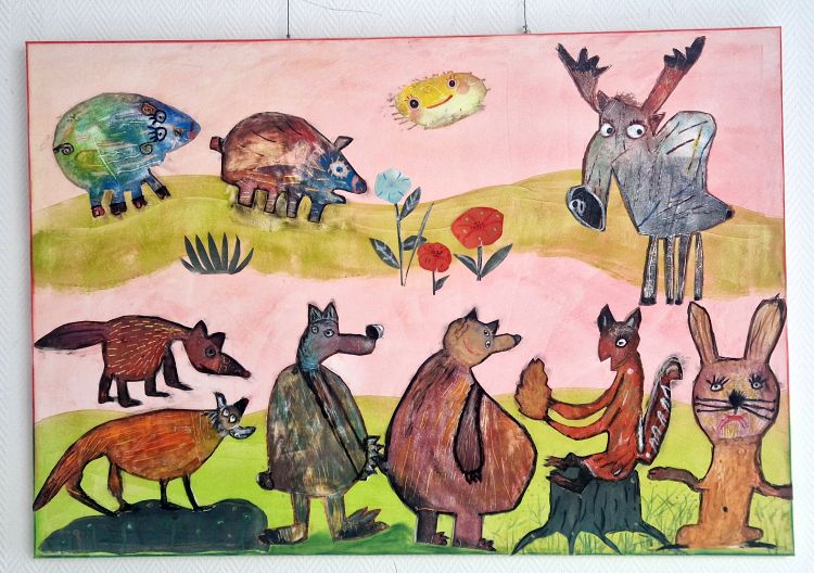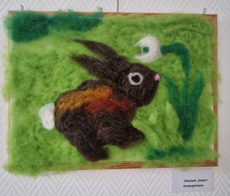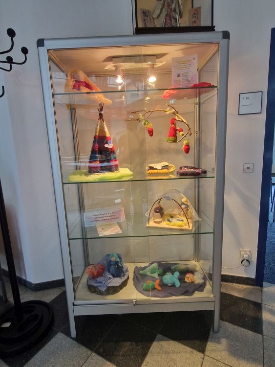 Eine Besonderheit sind die Filzarbeiten des Familienkindergartens. Da gibt es gefilzte Bilder an der Wand oder Figuren in einer Vitrine im 1. Obergeschoss sowie einer weiteren Vitrine im Foyer des 3. Obergeschosses zu bestaunen. Viel Spaß dabei!
