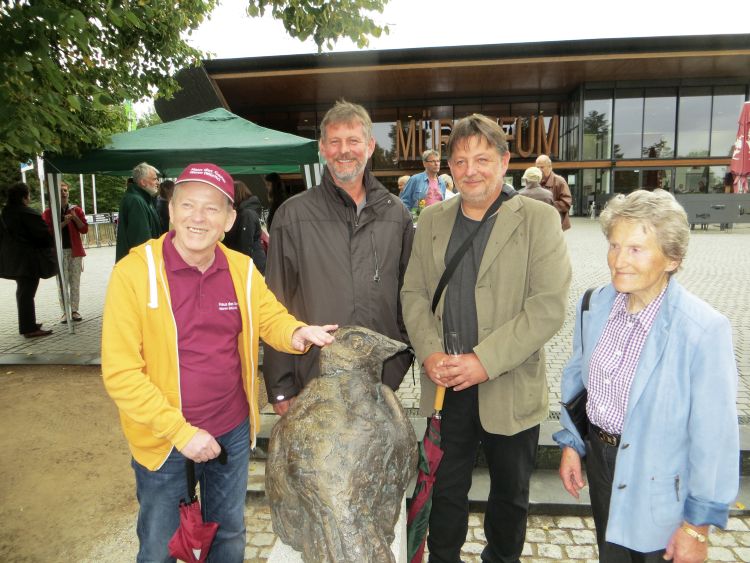 In diesem Jahr nun ist Walther Preik verstorben. Von dem Willen und den Bemühungen, diese Plastik in den öffentlichen Raum zu bringen, hat er noch zu Lebzeiten erfahren können. Es war schon immer sein Wunsch, dass seine Arbeiten den öffentlichen Raum bereichern und allen zugänglich sind. Dass dies nun ein weiteres Mal gelungen ist, verdanken wir zu allererst dem Engagement unserer Stadtführer und an ihrer Spitze Klaus Lambrecht. An viele Türen hat er zusammen mit Hildegard Krenz geklopft und ist hartnäckig dabei geblieben. Das Müritzeum, Frau Nagel, und die Stadt haben diese Idee ernst genommen und zur Umsetzung gebracht. Das Ergebnis ist nun an der Treppe zum Müritzeumsvorplatz zu sehen. Möglich wurde dieser passende Standort am Müritzeum nur, weil sich Sponsoren fanden, die diesem Ansinnen wohlwollend gegenüber standen und auch den Wert dieses Vorhabens erkannten. Hier und jetzt sollen sie nochmals benannt werden. Sie finden sich auch zu „Füßen“ des Sockels in Stein gehauen wieder: Danke an die Müritz-Sparkasse, an die Stadtwerke Waren GmbH, an die WOGEWA Waren mbH und an die Raiffeisenbank Mecklenburgische Seenplatte eG.