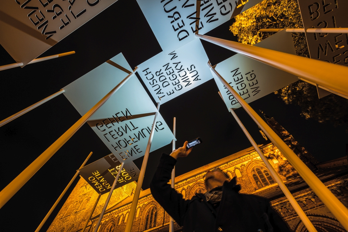 Nach einer kurzen Begrüßung am Zentralen Erinnerungszeichen an der Georgenkirche wird der Musiker Peter Dreier in der Kirche Lieder zum Thema Freiheit und Frieden präsentieren. Nach den ca. 20 Minuten Programm machen sich die Teilnehmer auf den "Weg der Kerzen" und gehen gemeinsam zur Marienkirche. Hier erleben Sie einen musikalischen Mix aus Glockenspiel, Orgel und Gesang, dargeboten von Solvig von Guenther und Jochen Levitz.