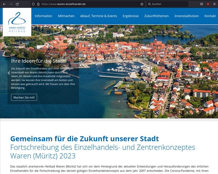 Unter www.waren-einzelhandel.de haben Sie die Möglichkeit die Zukunft der Innenstadt von Waren (Müritz) durch Ihre Ideen, Ihr Wissen und Ihre Kreativität mitzugestalten.