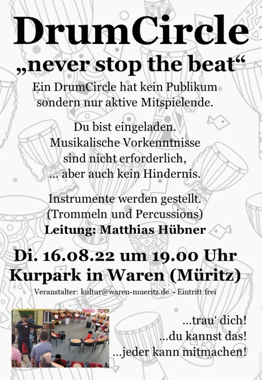 In einem Drum Circle gibt es kein Publikum, sondern nur Beteiligte. Jeder ist eingeladen, die Welt der Musik und des Rhythmus zu entdecken und ein großes Gefühl von Gemeinschaft zu erleben. Musikalische Vorkenntnisse sind nicht erforderlich, aber auch kein Hindernis. Instrumente (Trommeln und Percussion) werden gestellt. Leitung: Matthias Hübner