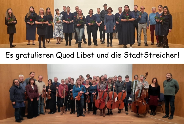 • Die StadtStreicher Waren und der Chor Quod Libet aus Waren (Müritz) geben ein gemeinsames Konzert. Der „StadtStreicher Waren e. V.“ ist ein Streichorchester, in dem ca. 30 Laienmusiker unterschiedlicher Alters- und Berufsgruppen unter der Leitung von Frank Philipp spielen. Im Vordergrund stehen die Freude am Musizieren.